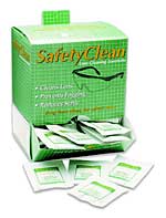 The H.L. Bouton Co.'s SafetyClean pre-moistened towelette is designed to coat a lens with an anti-fog/-static solution, is safe for use on glass or plastic lenses, and comes available in a completely assembled dispenser box with a fold-out hanger tab. The dispenser contains 100 foil-packed towelettes and can stand on a shelf or counter.